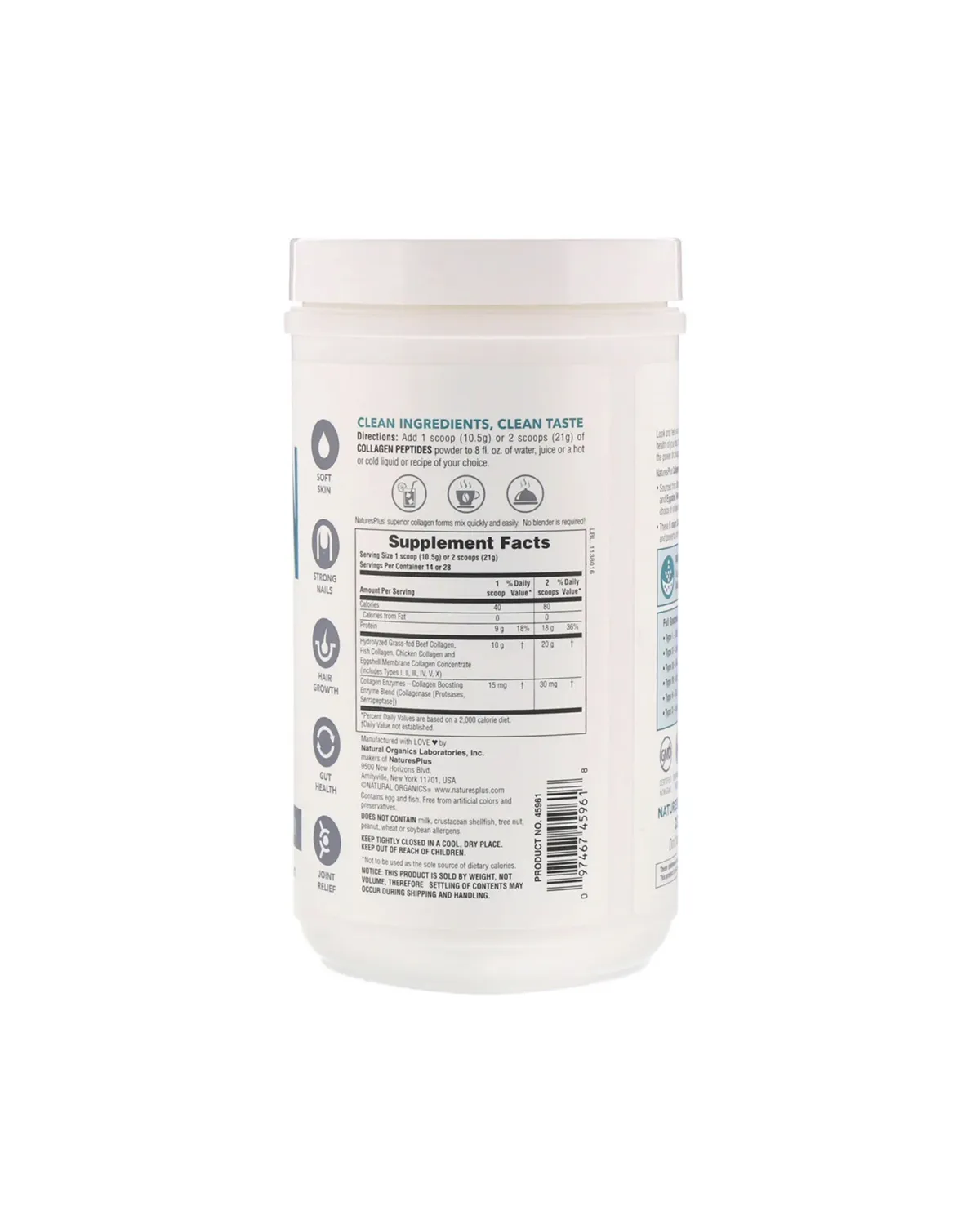 • Опис: Колагенові пептиди NaturesPlus – дієтична добавка, що містить шість типів природного колагену (I, II, III, IV, V і X). Продукт виготовлений з яловичини трав'яного відгодівлі, тріски з природного середовища, курей вільного випасу і мембрани яєчної шкаралупи. Гідролізована форма колагену з ферментами забезпечує максимальне засвоєння. Добавка може підтримувати еластичність шкіри, здоров'я суглобів, ріст волосся, міцність нігтів і роботу імунної системи.