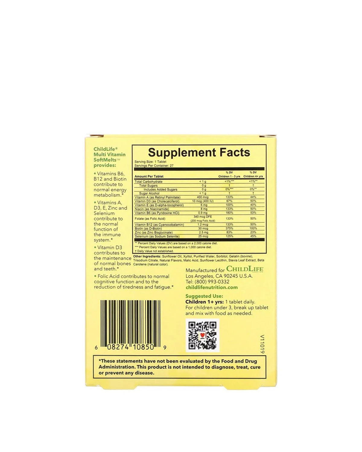 • Опис: Мультивітамін SoftMelts™ від ChildLife® містить: вітаміни B6, B12 та біотин, які сприяють нормальному енергетичному обміну. Вітаміни A, D3, E, цинк і селен, які сприяють нормальній роботі імунної системи. Вітамін D3, який підтримує здоров'я кісток і зубів. Фолієву кислоту, яка сприяє нормальній роботі когнітивної системи, знімає втому і знижує стомлюваність.