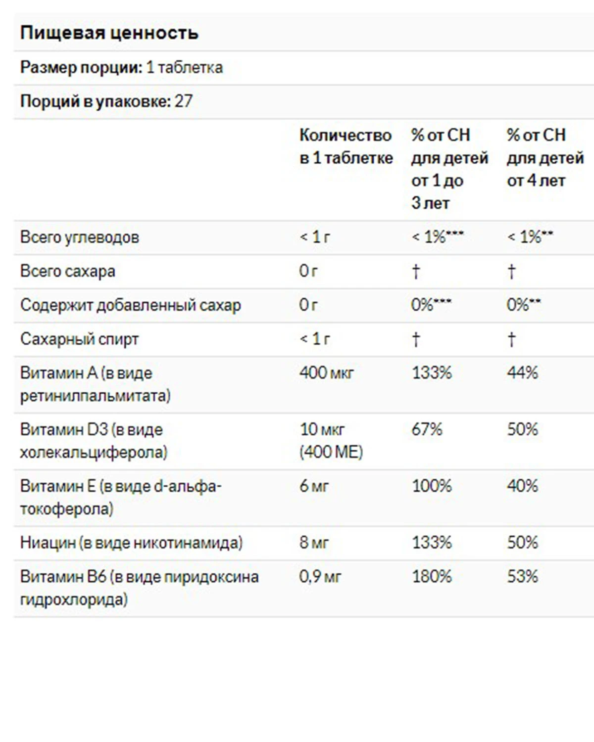 • Рекомендації щодо застосування: Діти старше 1 року: приймати по 1 таблетці на день. Дітям до 3 років: поламайте таблетку і змішайте з їжею в міру необхідності.